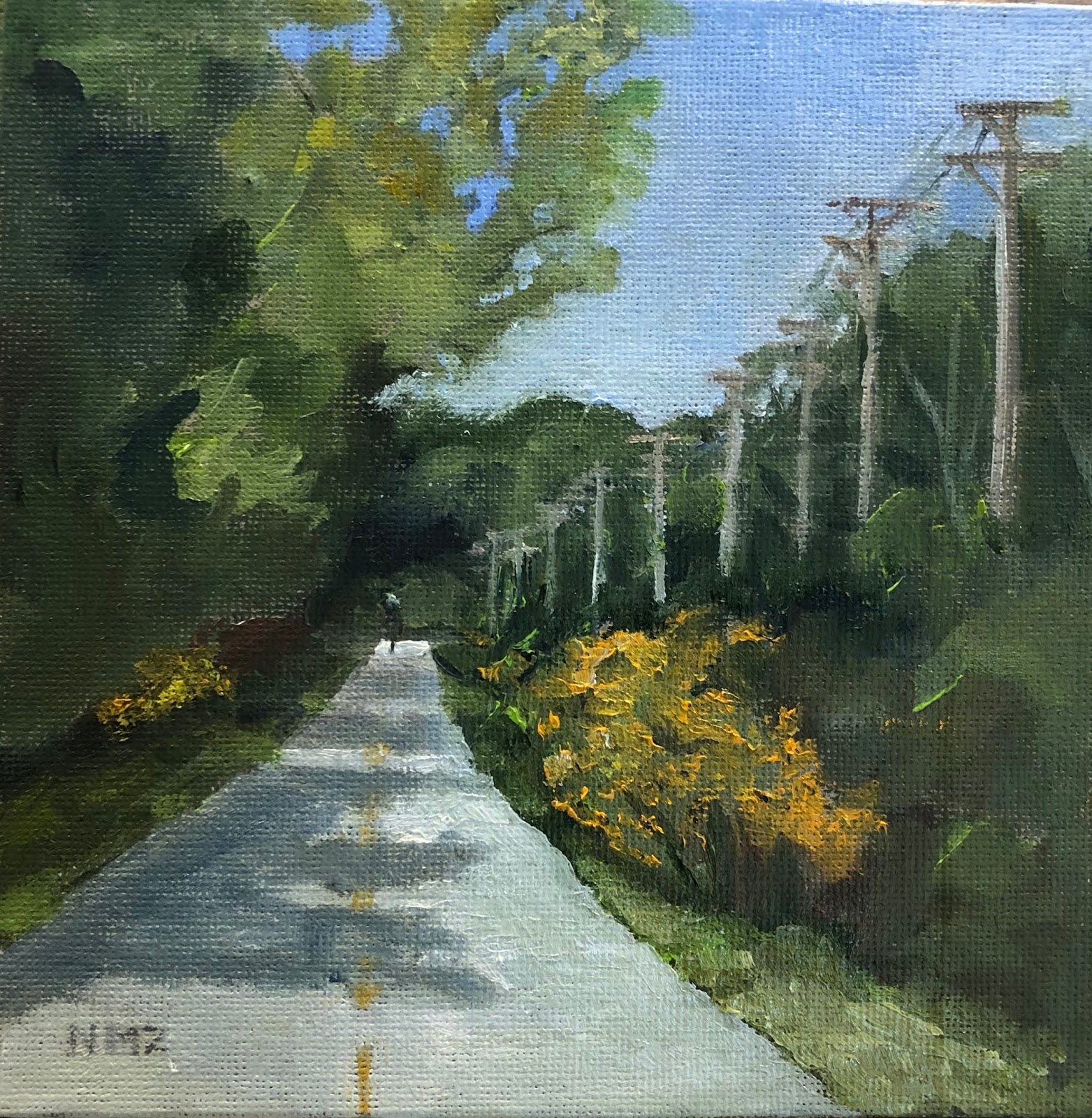 Upon showing up at last week's scheduled outing at McCarthy Park some of us discovered a huge cross country track event in progress and so we couldn't paint there. This was a source of aggravation to me but then Nan Zimdars send me an email describing how, despite driving to the park and being unable to paint, that she enjoyed the drive in the countryside. And on the following day because she had all her painting gear already packed and handy, she decided to do a quick painting of the southwest bike trail near her home. Turned out quite nice and so I thought I'd share it. Seems like our cancellation wasn't a total loss.